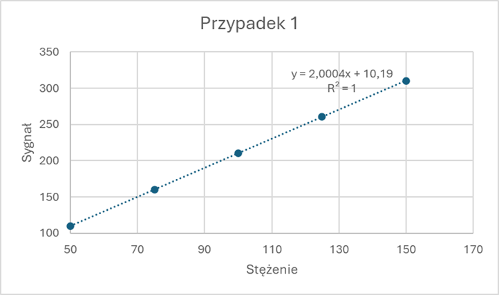 Współczynnik determinacji (R2) – Wyznacza się go poprzez podniesienie wartości R do kwadratu. Wskazuje on na dopasowanie modelu regresji, czyli tego jak dobrze można wyznaczyć stężenie na podstawie pomiaru sygnału.