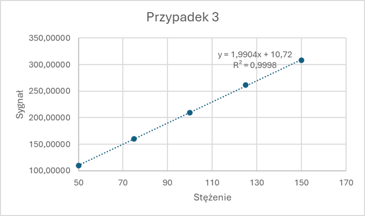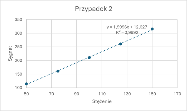 Na podstawie powyższych danych dość dobrze widać, że wartości R czy R^2 mogą być mylące. Przy wyznaczaniu liniowości warto dokładniej przyjrzeć się danym i ocenić czy zastosowany przez nas model kalibracji faktycznie jest najlepszy i zgodny z matematyką.