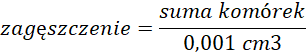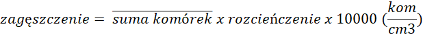 Po wykonaniu pomiaru przychodzi czas na obliczenia. W celu oznaczenia zagęszczenia komórek należy podzielić wynik pomiaru przez objętość komory. Ta zaś wyznaczona jest wymiarami siatki i wysokością szkiełka nakrywkowego. W przypadku dużych komórek, które liczymy w największych kwadratach komora ma wymiar 1 x 1 x 0,1 mm a więc 0,001 cm3.